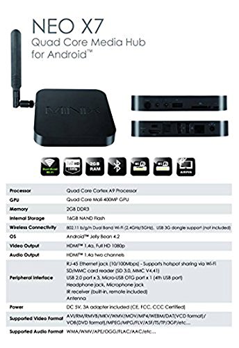 -. Feature : Quad-Core Cortex A9 Processor with Quad-Core Mali 400 GPU. Dual-Band Wi-Fi 802.11n 16GB Nand. Android 4.2.2 Jelly Bean. / A top Diamond Sponsor for Kodi / XBMC: Helping provide resources critical to the development and maintenance of Kodi / XBMC software and it's award-winning media experience. Developing the best hardware for the best user experience. / Unlike Roku, Apple TV, or Google Chrome, the Minix Neo is not just a simple media streamer. You are free to install your own applications and save media files right inside it's 16GB internal storage. / Would be ideal for Digital Signage (as a media player), Smart Conference room, or even as mini Personal Computer. / 1 year warranty available for players purchased from Amazon.com from Minix. Not available for other sellers.