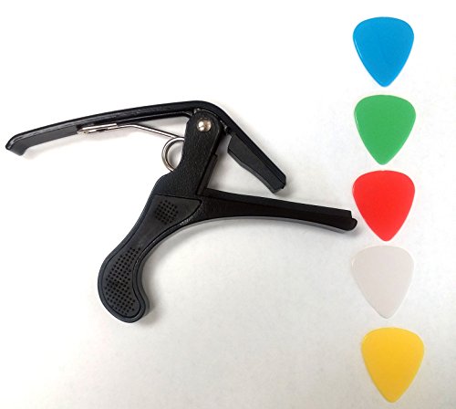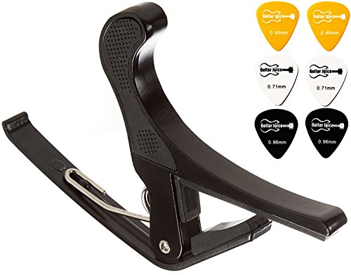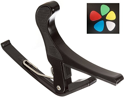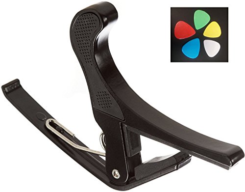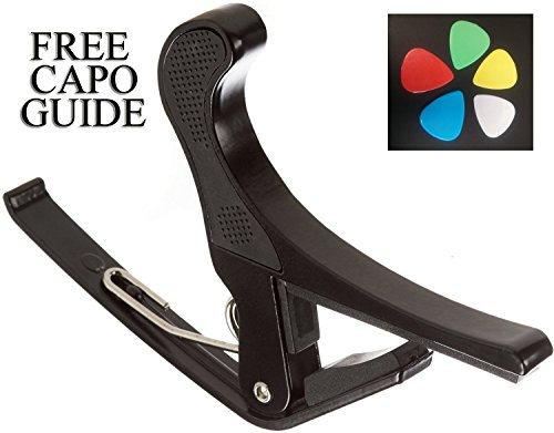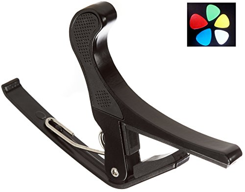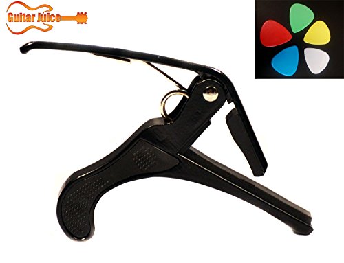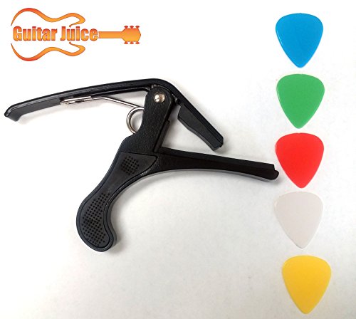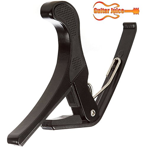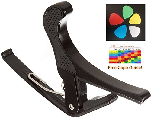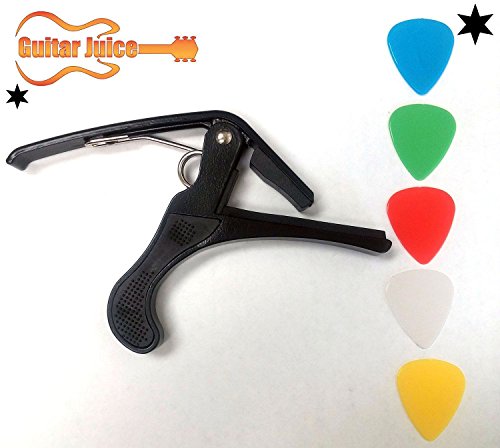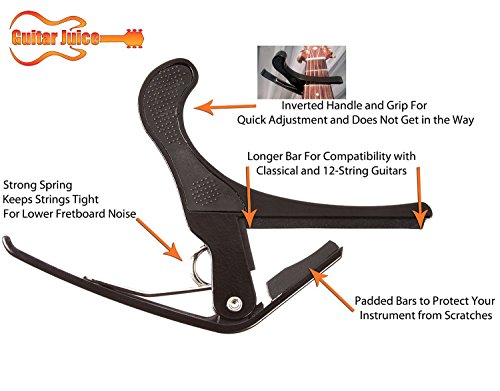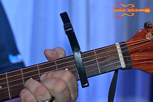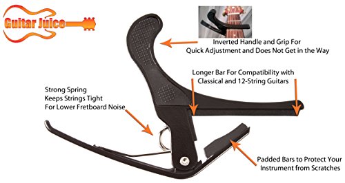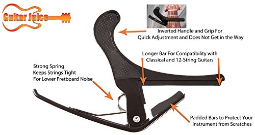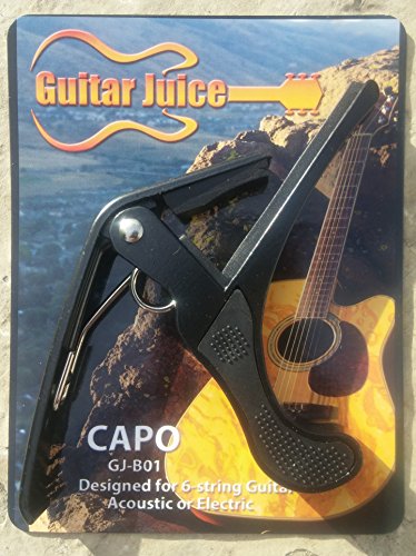 Studio : Guitar Juice Publisher : Guitar Juice Product Description Beginners and Pros alike will love the Guitar Juice GJ-B01 Black Guitar Capo * Great for 6 or 12 String Acoustic, Electric or Classical Guitars * Designed To Quickly Move Up and Down the Fretboard * Stays in Tune and No Fret Buzzing for a Great Sound * Long Lasting Premium Performance Quality Metal and Spring for Years of Use * Pads to Protect Your Instrument * Can also be used with ukulele, banjo and mandolin *5 FREE Picks one of each .46mm, .60mm, .73mm, 1mm, and 1.5mm in various colors ***1 Year Warranty Registration and Free Guitar Tips and Tricks.**** Add to Cart and start sounding great! 0 |