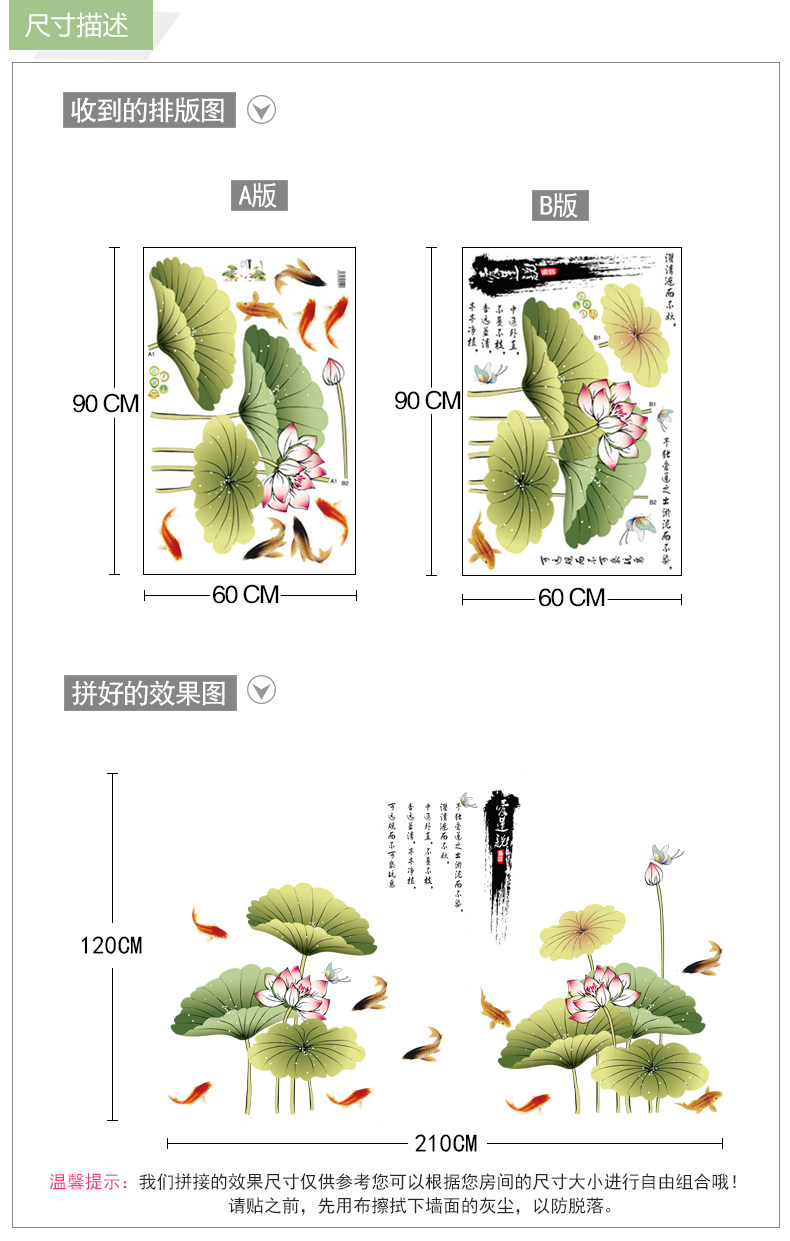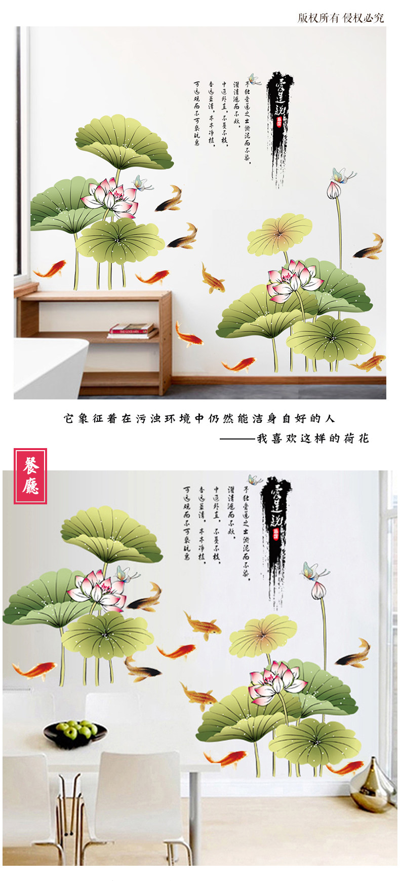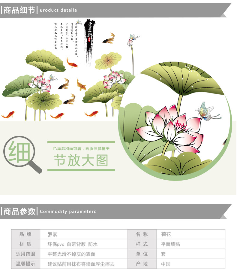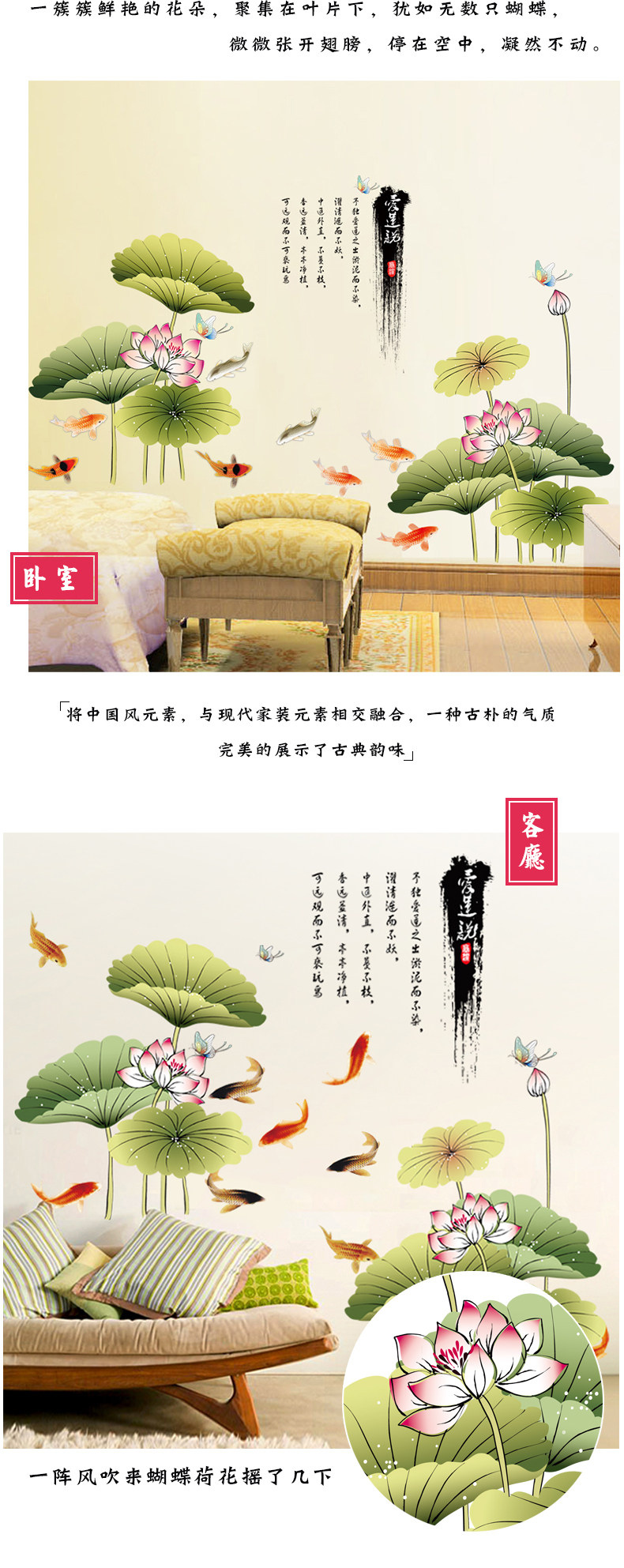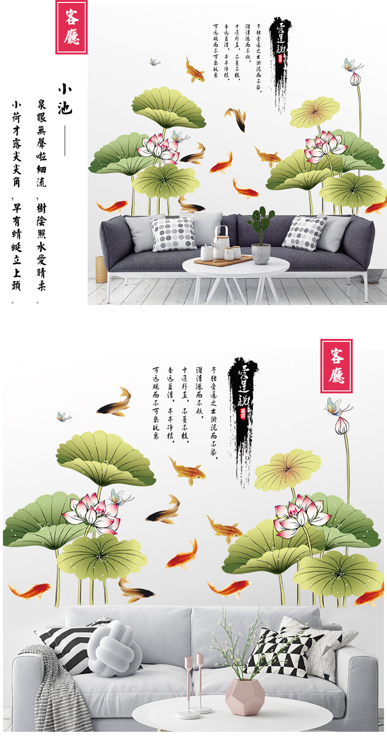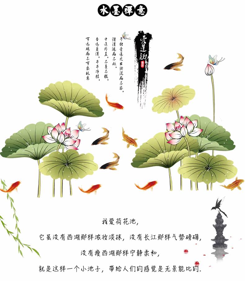 中国风荷花墙贴客厅壁纸墙纸自粘贴画卧室房间宿舍装饰品防水贴纸