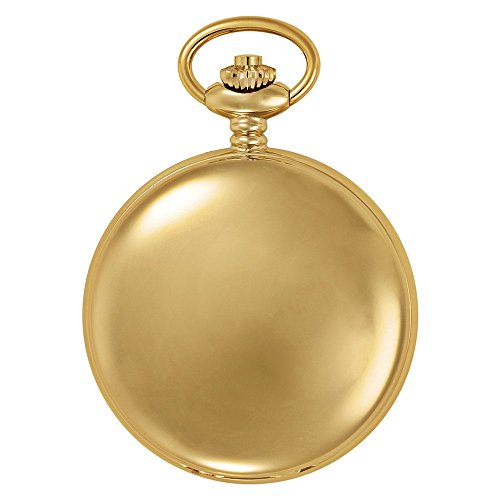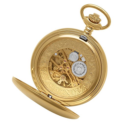 -. Feature : Classic and elegant gold-tone 17 jewel mechanical polished finish double hunter exhibition pocket watch perfect for engraving / Both front and back covers open to expose elegant 17 jewel mechanical movement and it's moving parts / Antique style blue cobalt hour, minute and seconds hands plus scratch resistant mineral crystal / Includes matching 14" curb pocket watch chain with sP.R.Ing ring attachment / Arrives with deluxe draw string pouch and gift box, Selvyt polishing cloth, operating instructions and lifetime limited warranty card