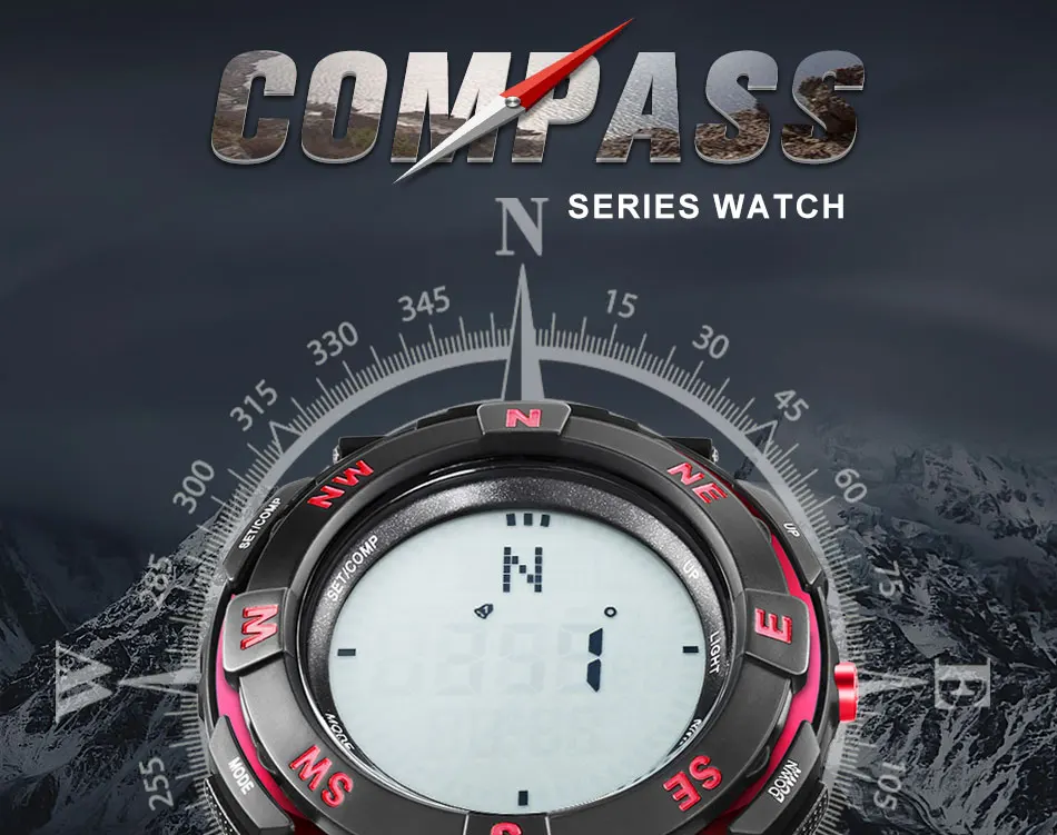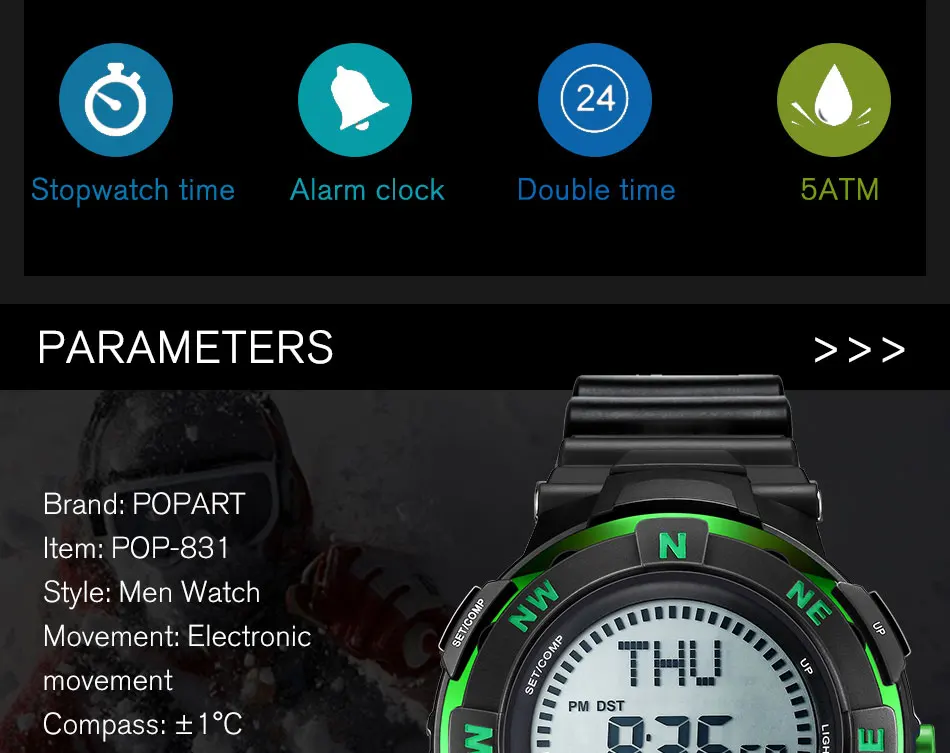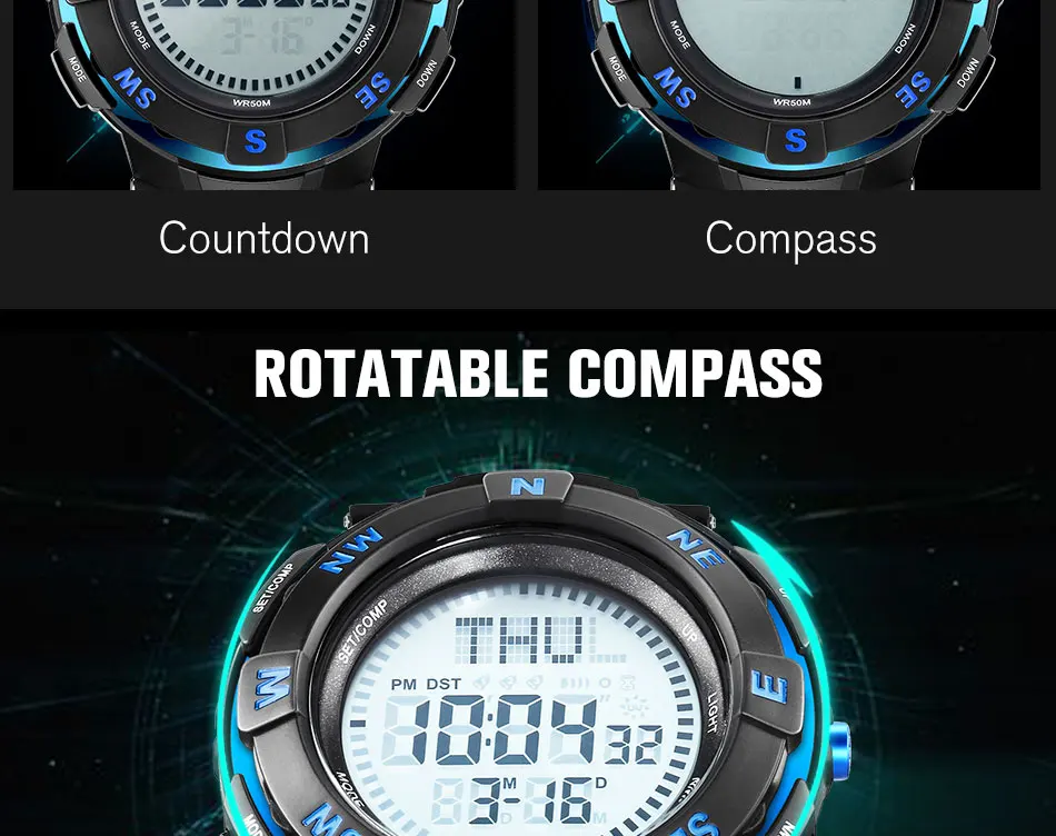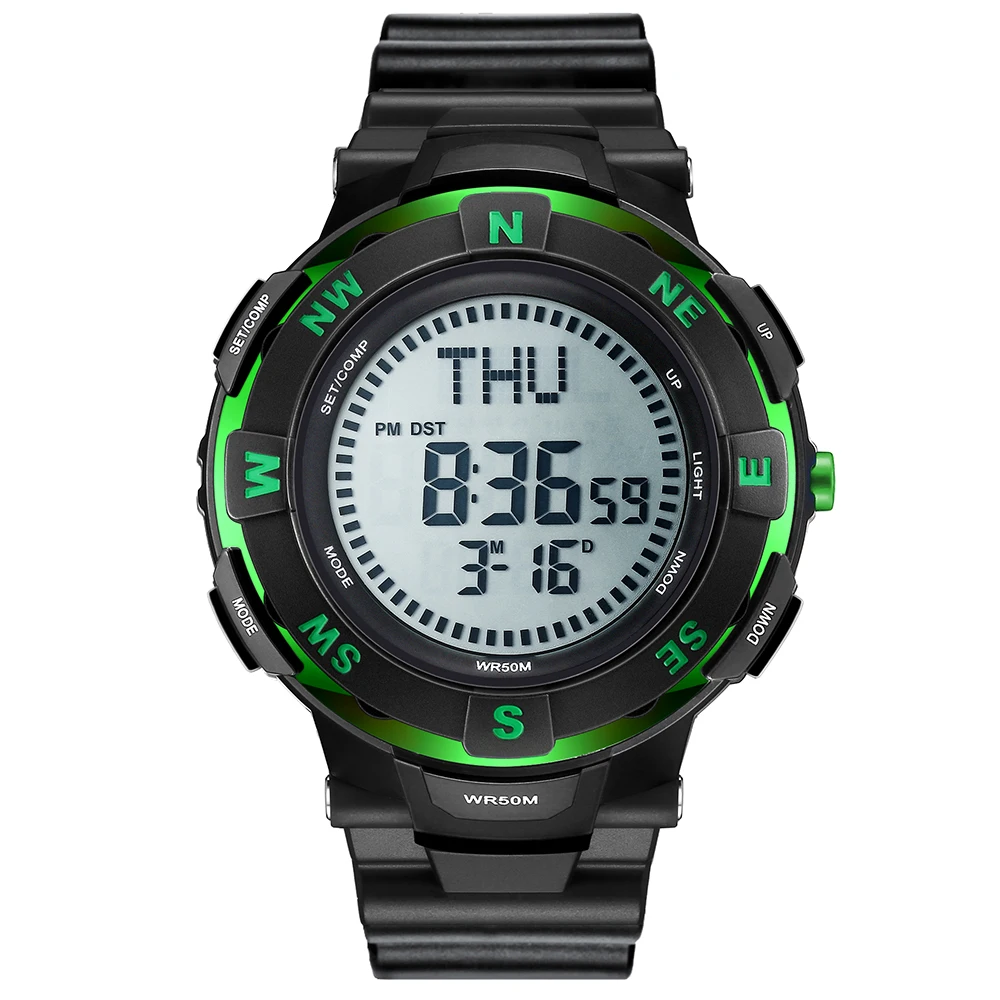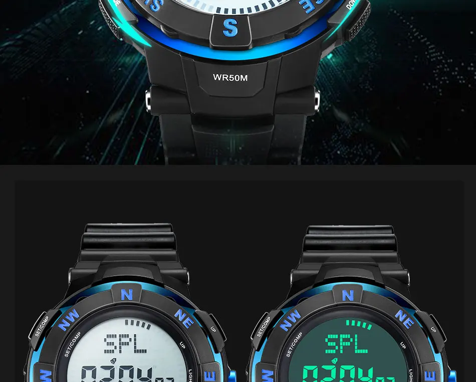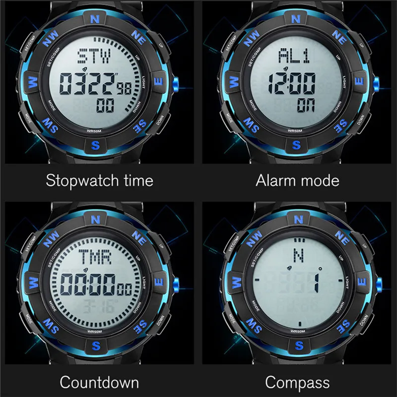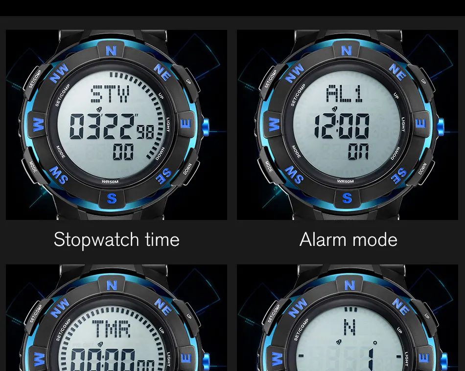 Feature:Water Resistant,LED display,Stop Watch,Compass,Back Light,Complete Calendar,Week Display,Alarm,Chronograph