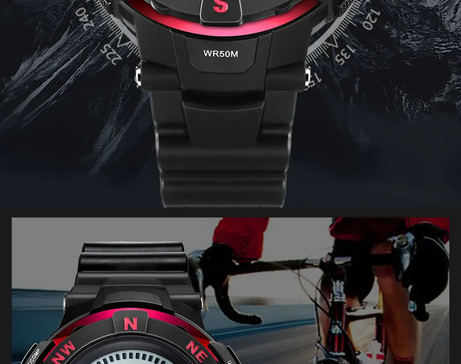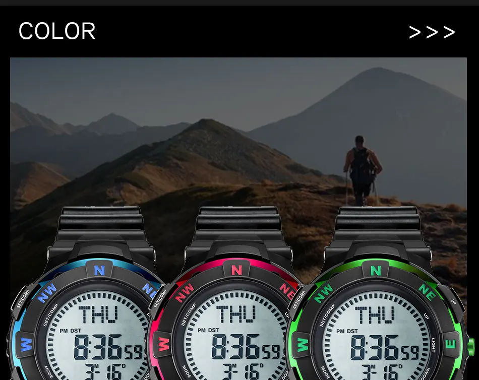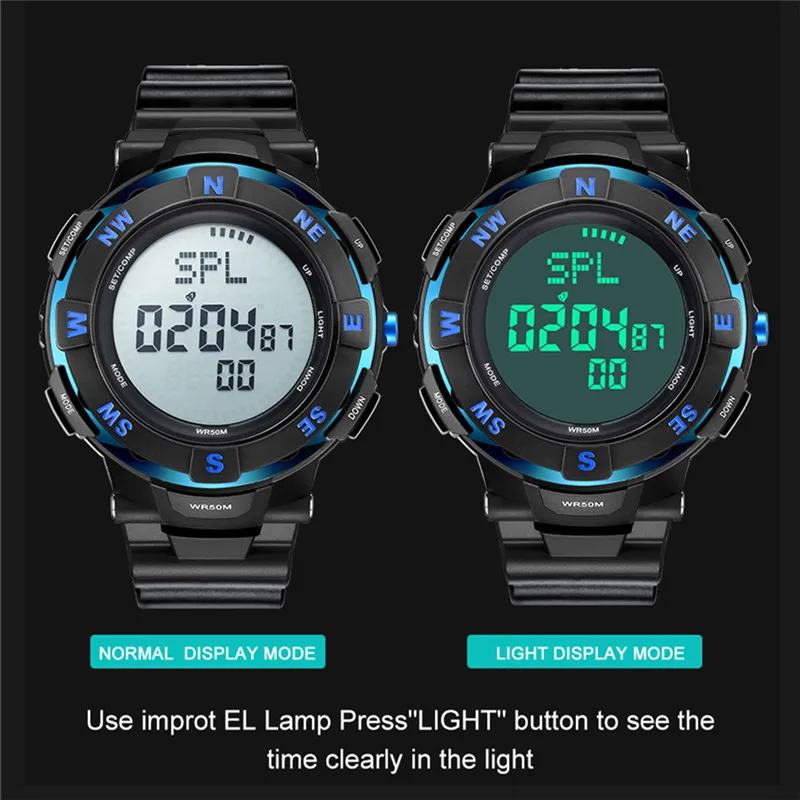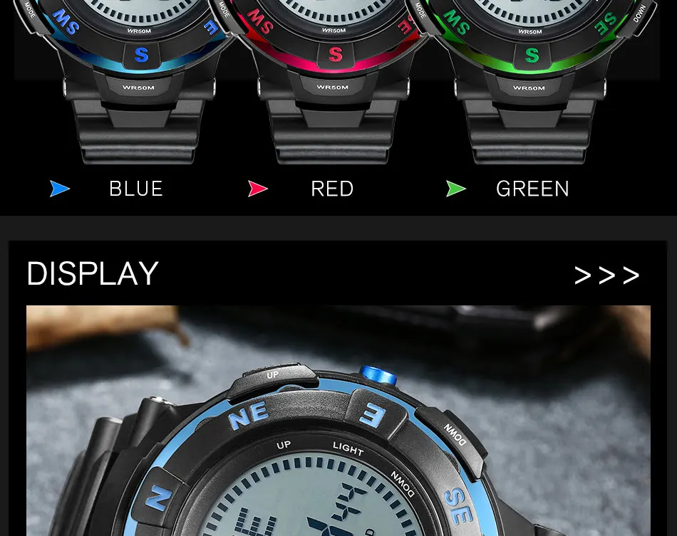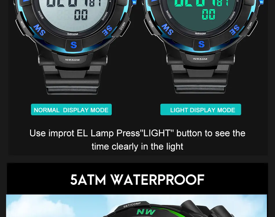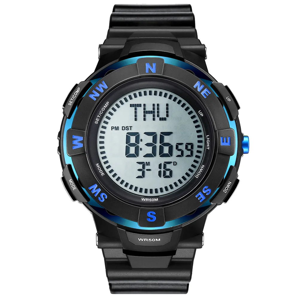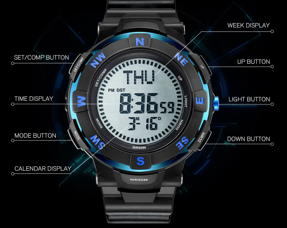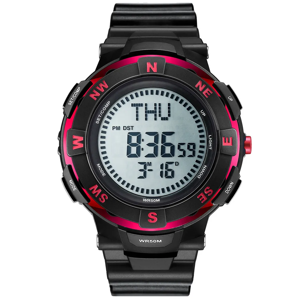 Feature:Water Resistant,LED display,Stop Watch,Compass,Back Light,Complete Calendar,Week Display,Alarm,Chronograph