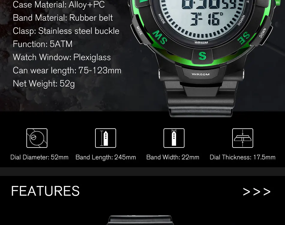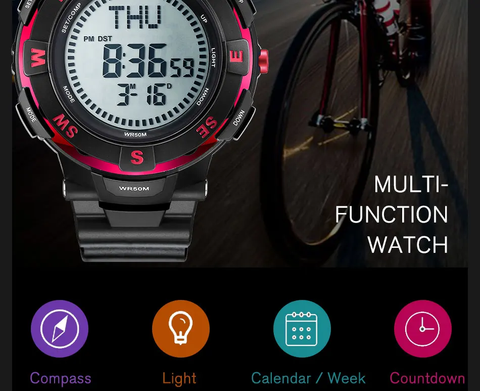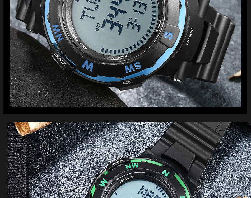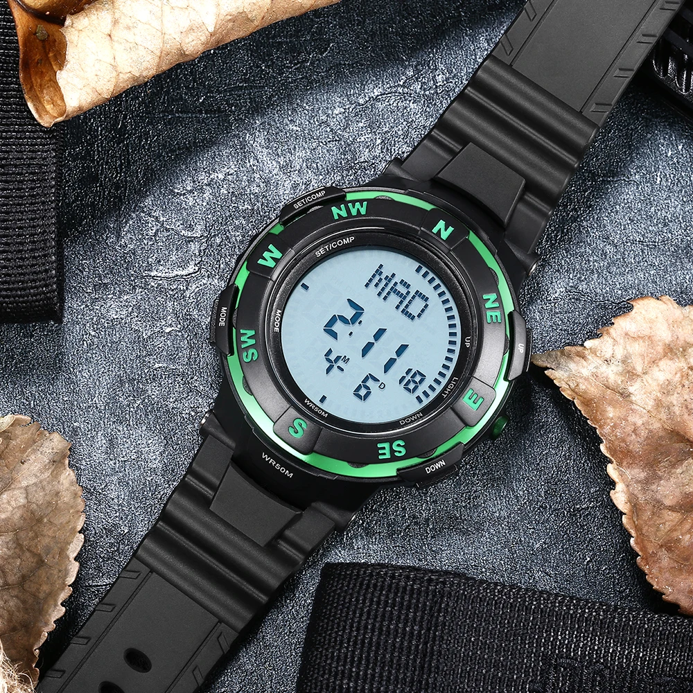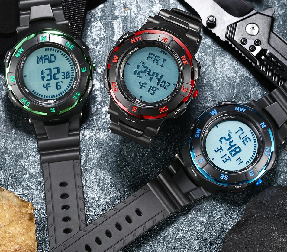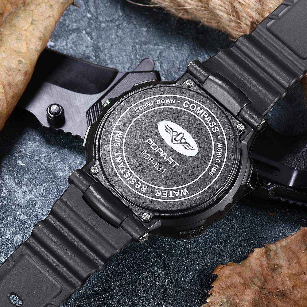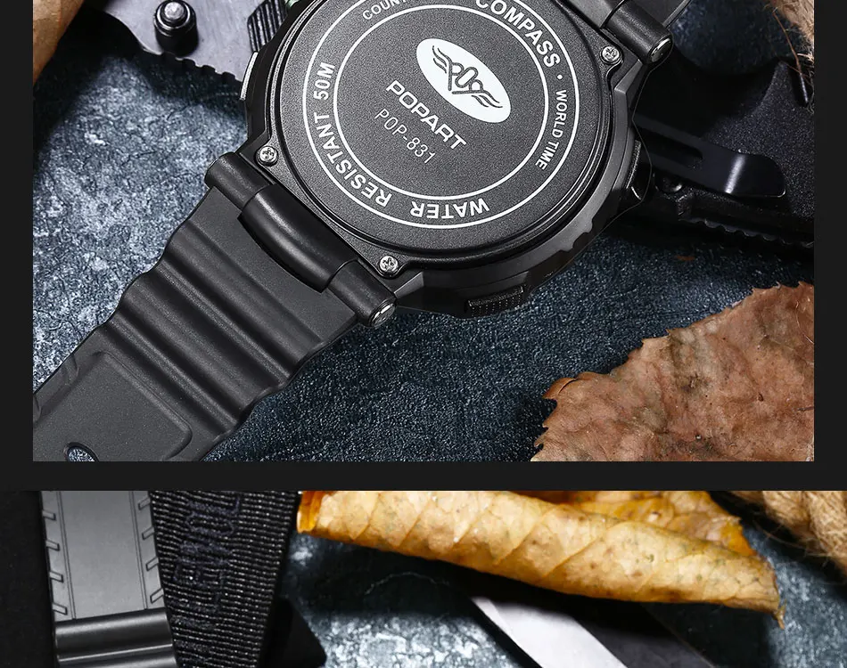 Feature:Water Resistant,LED display,Stop Watch,Compass,Back Light,Complete Calendar,Week Display,Alarm,Chronograph