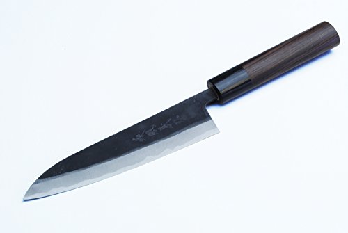 Our handmade Yoshihiro Mizu Yaki Aogami Super Blue High Carbon Steel Kurouchi Petty Utility knife are unparalleled in their performance. Mizu Yaki is a meticulous process of pure water quenching that draws out the hardness of refined steel while infusing it with enough resiliency to perform consistently in the most exacting of conditions. Exemplifying the most intricate techniques of forging, layering, and hammering, Kurouchi translates as Black Forged and is a traditional Japanese method of crafting high carbon knife. This unique style of forging offers an unpolished rustic finish. Super Blue High Carbon Steel with a hardness on the Rockwell scale of 64-65 is considered to be the top of its class in high carbon steel metallurgy. It is ranked above Blue Steel #1. It is sandwiched in between carbon steel in the traditional Warikomi style to add to its durability and ease sharpening. It takes a very high degree of skill to create knives of such exceptional performance and exquisite beauty with a steel of this caliber and is a testament to the extraordinary skill of the artisans. Our Yoshihiro Kurouchi Petty Knife is forged with particular care to create a medium sized sturdy blade that can maneuver through both small and big jobs with finesse. A razor sharp Petty knife can intricately carve and style vegetables and fruits for beautiful presentations and garnishes, performing just as well for bigger jobs such as preparing meals. Even the simplest of tasks are elevated with a handcrafted knife that is as beautiful as it is functional.