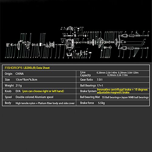 -. Feature : ✔ ① Weight: 211g/7.4oz ,Gear Ratio: 7:0:1 ,Max Power Drag: 5.5KG , Line Capacity (mm/M): 0.260/140; 0.280/120; 0.30/110 / ✔ ② 17Stainless Steel Ball Bearings + 1 way clucth corrosion protection. / ✔ ③ High strength aluminum frame, strong and durable with perfect texture. The solid aluminum provides increased corrosion resistance from saltwater. / ✔ ④ Dual Braking System can controll fishing line better,especially when you are catching a big fish. / ✔ ⑤ Right-Handed Reel ASIN:B01F8AJT8A