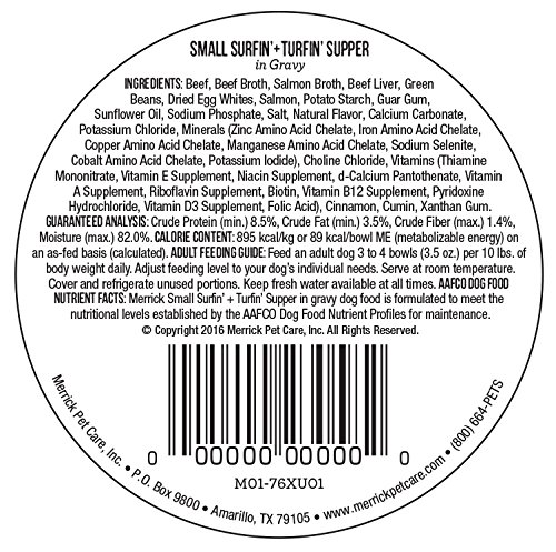 -. Binding : Misc. -. Brand : Merrick -. Label : Merrick Pet Care -. Manufacturer : Merrick Pet Care -. PackageQuantity : 1 -. ProductGroup : Pet Products -. ProductTypeName : PET_SUPPLIES -. Publisher : Merrick Pet Care -. Studio : Merrick Pet Care -. Title : Merrick Lil' Plates Grain Free Small Breed Wet Dog Food, 3.5 oz, 12 count