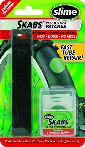 Studio : Slime Publisher : Slime Binding : Sports Product Description Slime SKABS Peel-and-Stick Patches patch up tube tire punctures with no glue and no mess. Kit contains 6 pre-glued 1-inch patches, 2 tire levers, and a round metal scuffer. Patch your bike's innertube quickly and easily with this compact kit, which can be conveniently stored in a bike bag. 0