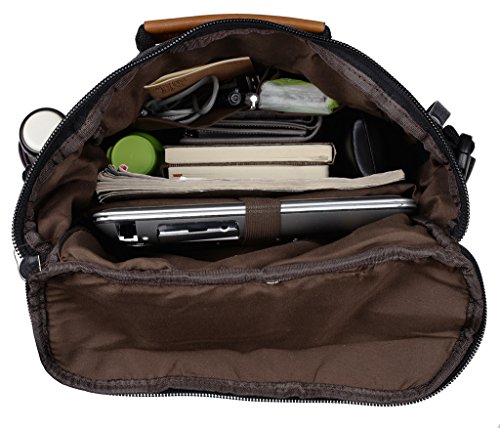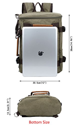 -. Feature : SPECIAL 3-WAY CARRYING --- Convertible versatile bag! You can carry it as a handbag/single shoulder bag/backpack as there is a removable short shoulder strap (strap length up to 57.16"). / PREMIUM MATERIAL --- Durable Canvas with silver color hardware; heavy duty zippers and brown fabric lining; adjustable nylon strap to prevent slidding off your shoulder. Every stitching joints have been reinforced for durability. / WELL ORGANIZATION --- Exterior: 2 front zipper pockets, 1 side open pockets. Interior: 1 big compartment with 2 open pockets and 1 laptop section for 13" laptops. / LARGE CAPACITY --- This backpack can accomodate your books, smartphones, notebook, wallet, umbrella and 13" thin laptop whose size is under 12.99"(length) x 9.1"(width), and so on. / DIMENSIONS --- 12.00"(bottom length) x 14.96"(height) x 5.31"(bottom width). the weight is 2.31 lb.
