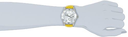 Silver tone dial with black hands, black decorative hearts with 40 white crystals; luminous; unidirectional stainless steel bezel with silver ring