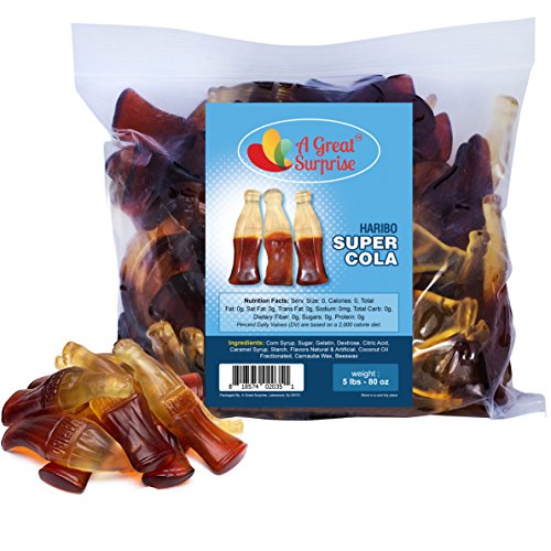 -. Binding : Grocery -. Brand : A Great SurP.R.Ise -. IsAdultProduct : 0 -. Label : Haribo Of America, Inc. -. Manufacturer : Haribo Of America, Inc. -. PackageQuantity : 1 -. ProductGroup : Grocery -. ProductTypeName : GROCERY -. Publisher : Haribo Of America, Inc. -. Studio : Haribo Of America, Inc. -. Title : Gummy Cola Bottles