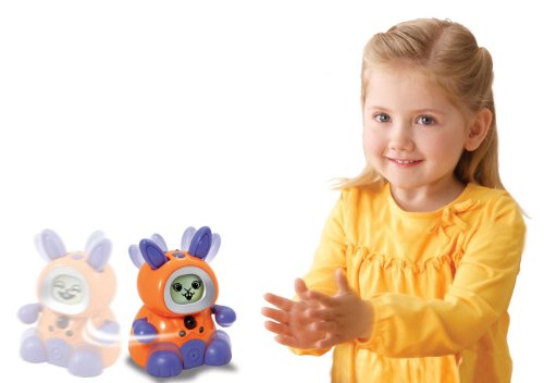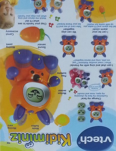 -. Feature : Choose from three sets of eyes, three mouths, and three noses to create a customized face / Recognizes and interacts with another Kidiminiz friend by talking, singing a duet, and playing together / KidiBunny functions as a real clock and alarm / Detects and chases the included carrot play piece, clap your hands to activate movements, singing, and dancing / Says over 25 different phrases