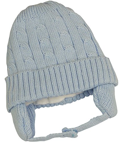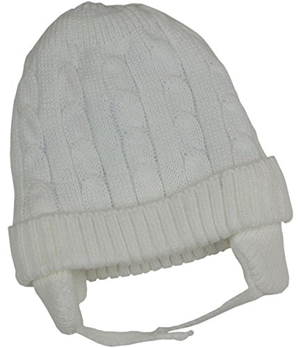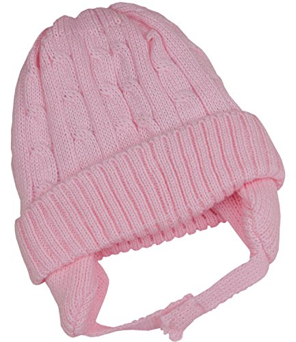 Product Description This is a lovely little soft cable knitted hat made from 100% Acrylic and machine washable at 30 degrees. It has cute ear flaps to keep baby warm and fastens with Velcro® under the chin. Available in ages 6-12 and 12-18 months in pink, sky blue and white. 0