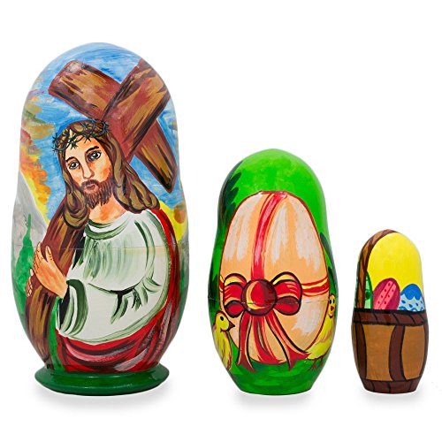 -. Title : 4.25" Set of 3 Jesus with Cross, Easter Eggs Wooden Nesting Dolls