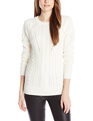 Crew-neck sweater featuring cable-knit front with open-knit trim at shoulders and upper arms