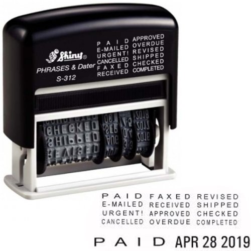 -. Binding : Office Product -. Brand : Shiny -. Color : Black -. Feature : Prints the date plus your choice of 1 of 12 stock phrase messages / Date Height: 1/8", Total Impression Area: 1/8" x 1-3/4" / Good for 10 years of dates / Thousands of impressions before re-inking is necessary / Black Ink -. Label : DiscountRubberStamps -. Manufacturer : DiscountRubberStamps -. Model : S-312 -. MPN : 42514-K -. PackageQuantity : 1 -. PartNumber : 42514-K -. ProductGroup : Office Product -. ProductTypeName : OFFICE_PRODUCTS -. Publisher : DiscountRubberStamps -. Studio : DiscountRubberStamps -. Title : 1 X Self-inking Date and Message Stamp (Black)