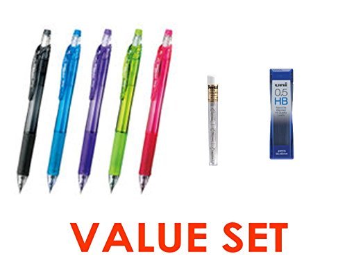 Pentel EnerGel X 0.5mm Rubber Grip Type Mechanical Pencils 5 Color Body Assort / Black,Green,Pink,Blue,Violet Body / Total 5 Pencils + 4 Erasers + Strength & Deep & Smooth Uni 0.5mm HB Top quality Diamond Infused Leads [Nano Dia-40 Leads] Value Set (With