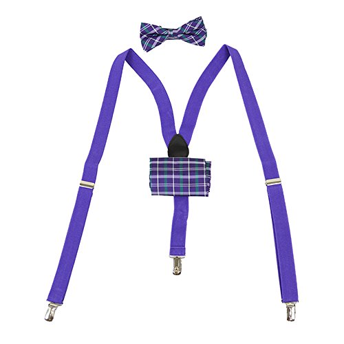 (Umo Lorenozo)/Accessories/Suspenders Cummerbunds/DIRECT FROM USA/Men's Purple Teal Plaid Formal 3 PC Clip-on Suspenders, Bow Tie and Hanky Hankie Set