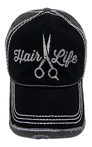 -. Feature : Adjustable Velcro Back/100% Cotton / Silver Glitter " Hair Life " Scissors/Shears Design / Distressed (Torn bill) Look Black and Grey Baseball Cap / Super Cute! / Ships from the USA!
