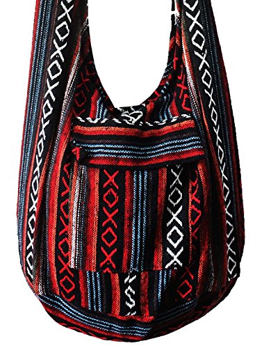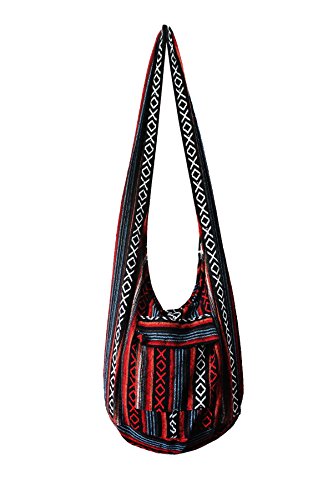 Thai Tribal Hmong Boho Striped Ethnic Cotton Boho Sling Crossbody Bag Shoulder Bag Thai Pattern Bag Thai Top Zip Handmade Asia Bag (Stripe Red1)