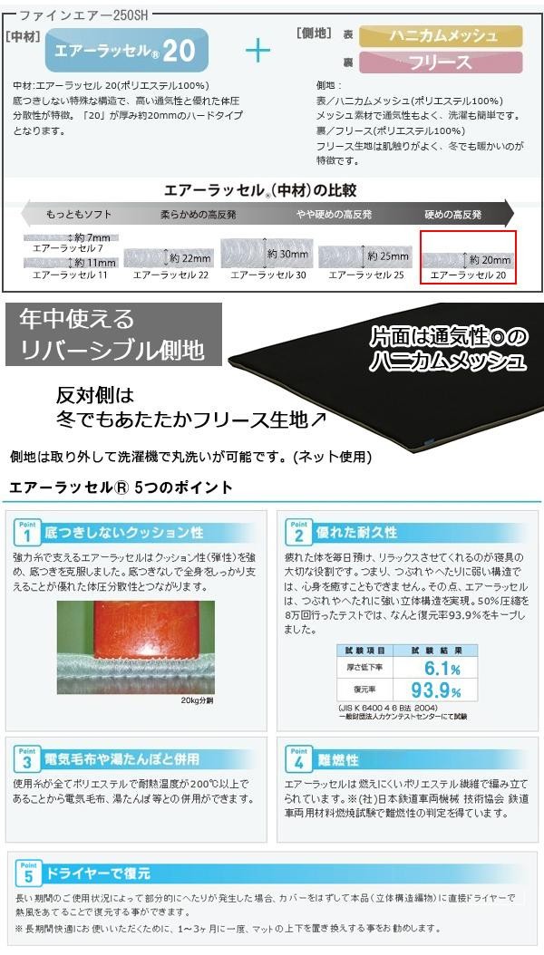 | 中材で使用されている「エアーラッセル」は、底つきしない特殊な構造で、高い通気性と優れた体圧分散性が特徴です。側地の表はメッシュ素材で通気性もよく、洗濯も簡単です。裏はフリース生地で、冬でも暖かく、オールシーズン快適に過ごすことが出来ます。 |