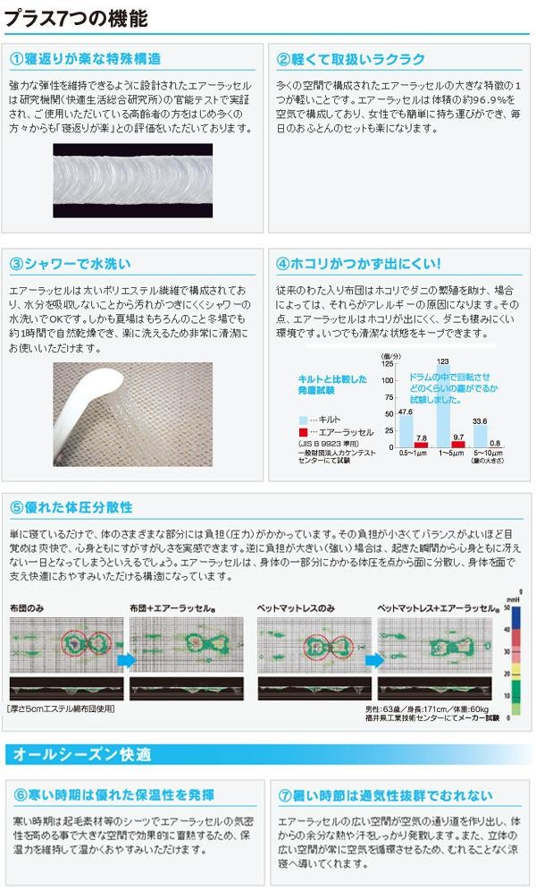 中材で使用されている「エアーラッセル」は、底つきしない特殊な構造で、高い通気性と優れた体圧分散性が特徴です。側地の表はメッシュ素材で通気性もよく、洗濯も簡単です。裏はフリース生地で、冬でも暖かく、オールシーズン快適に過ごすことが出来ます。 |