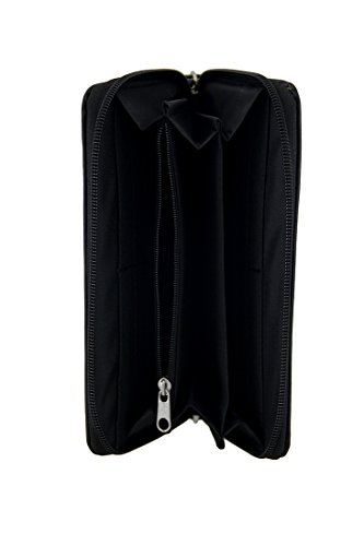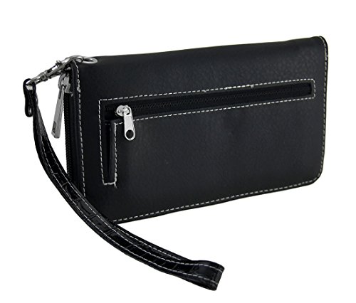 Studio : Zeckos Publisher : Zeckos Product Description Featuring a rhinestone covered skull and embroidered red roses with rhinestone centers, the only thing missing from this wallet is you! This 7.5 inch long, 4 inch high, 1 inch wide (19 X 10 X 3 cm) black vinyl wallet keeps you organized with 12 card slot, 3 slip pockets and 1 zippered change pouch inside and an expandable zip pocket on the back. It includes a removable wrist strap for when you don't want to carry a purse, and it secures with a wrap around zipper. 0