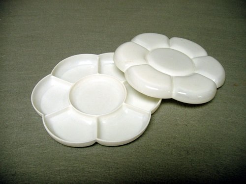 -. Feature : white plastic / two small nine-sectioned blossom palettes that fit together / made of convenient lightweight durable plastic / great for mixing, storing and transporting color