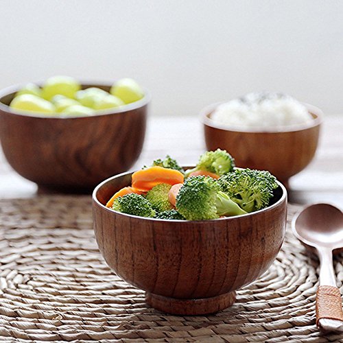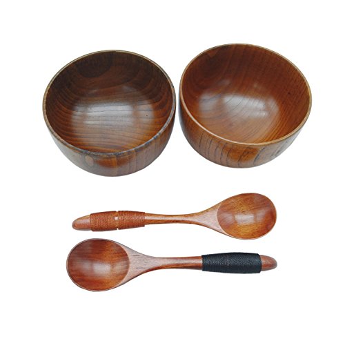 Handmade Small Round Wooden Rice Soup Salad Snack Yogurt Bowls with Spoons Kit for Serving Home Kitchen Tableware, Set of 2, 4 Packs, Wood Color