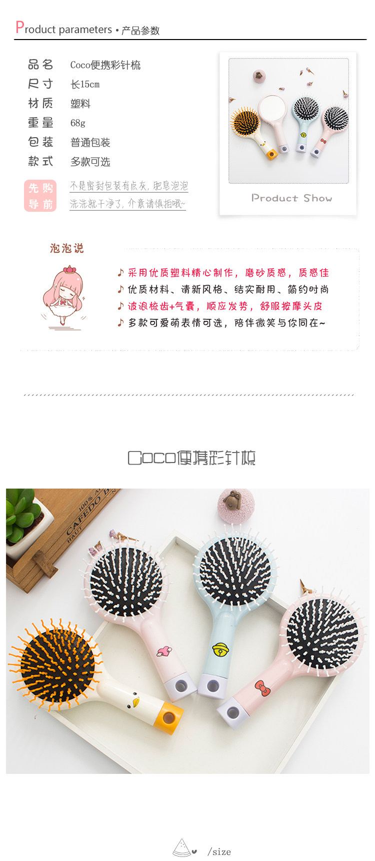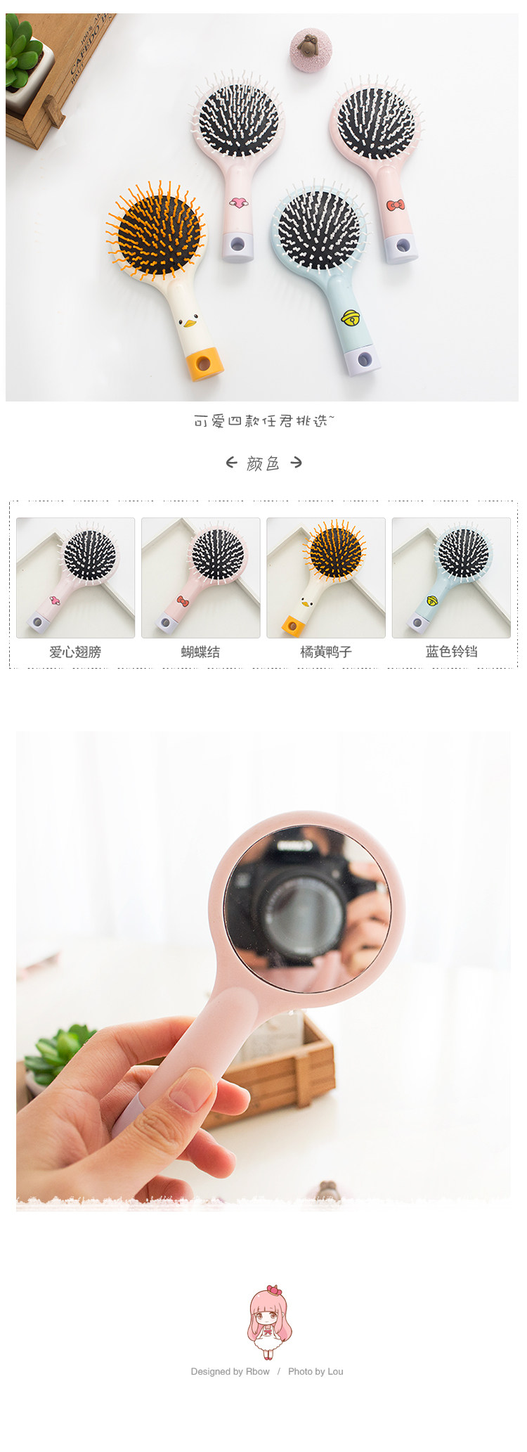 韩国防静电按摩梳创意卡通气囊梳带镜子韩版卷发顺发迷你气垫梳子