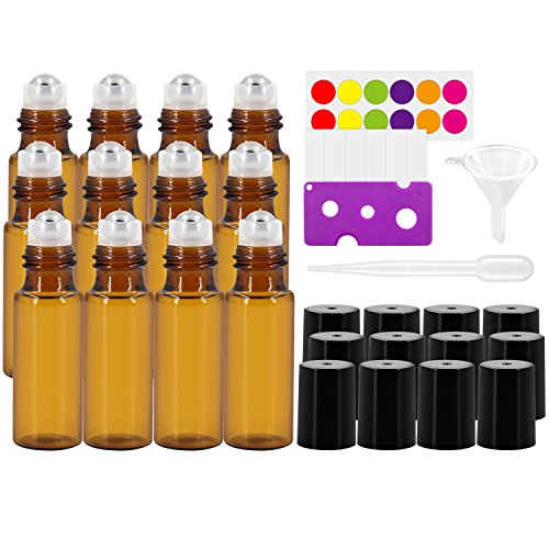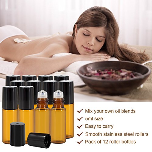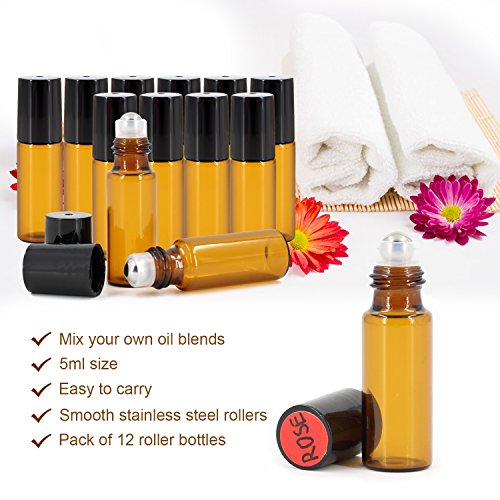 - ACTURL AMBER GLASS-- 12 New 5ml Amber Glass Roller Bottles with stainless steel roller balls and black caps for easy even oil application, no more rollers getting stuck or falling out