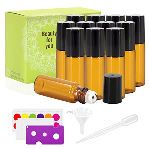 Mavogel 12 Pack 5ml Amber Glass Roller Bottles With Stainless Steel Roller Ball - Include 36 Peices Labels, Essential Oils Opener, 1ml Pipettes, Funnel