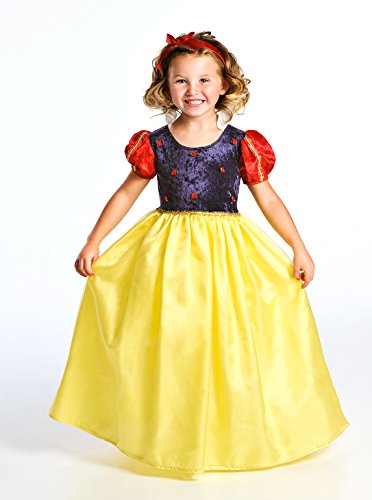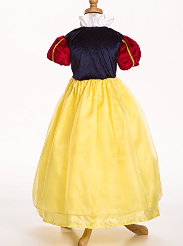 This elegant Snow White gown has red crushed velvet sleeves with gold trim that meet a navy blue velvet bodice dotted with red ribbon roses and gold trim waist. The skirt is a cheery yellow china silk overlaid with shimmery organza. Lastly, a delicate white ruffled collar graces the neckline. The bodice is stretchy to accommodate most body sizes. Little Adventures is not affiliated with Disney or Snow White and the Seven Dwarves. Accessories Sold Separately. Available in sizes Small (1-3 Yrs.), Medium (3-5 Yrs.), Large (5-7 Yrs.), and X-Large (7-9 Yrs.).Feature