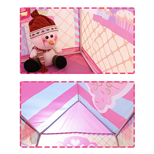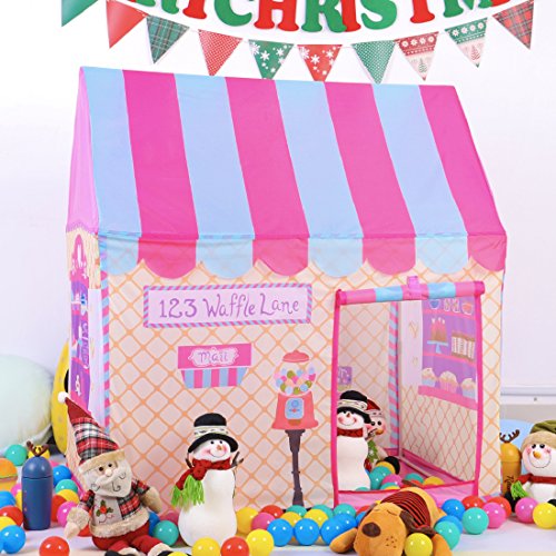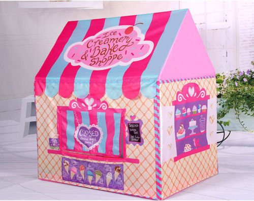 Ice Creamery & Bake Shoppe Play Tent is so adorable for Pretend Play. It has a side roll-up window to sell all kinds of Pretend Food from cupcakes and cookies to Banana Split, Hot Fudge Sundae and several flavors of ice cream cones as displayed on the tent graphics.