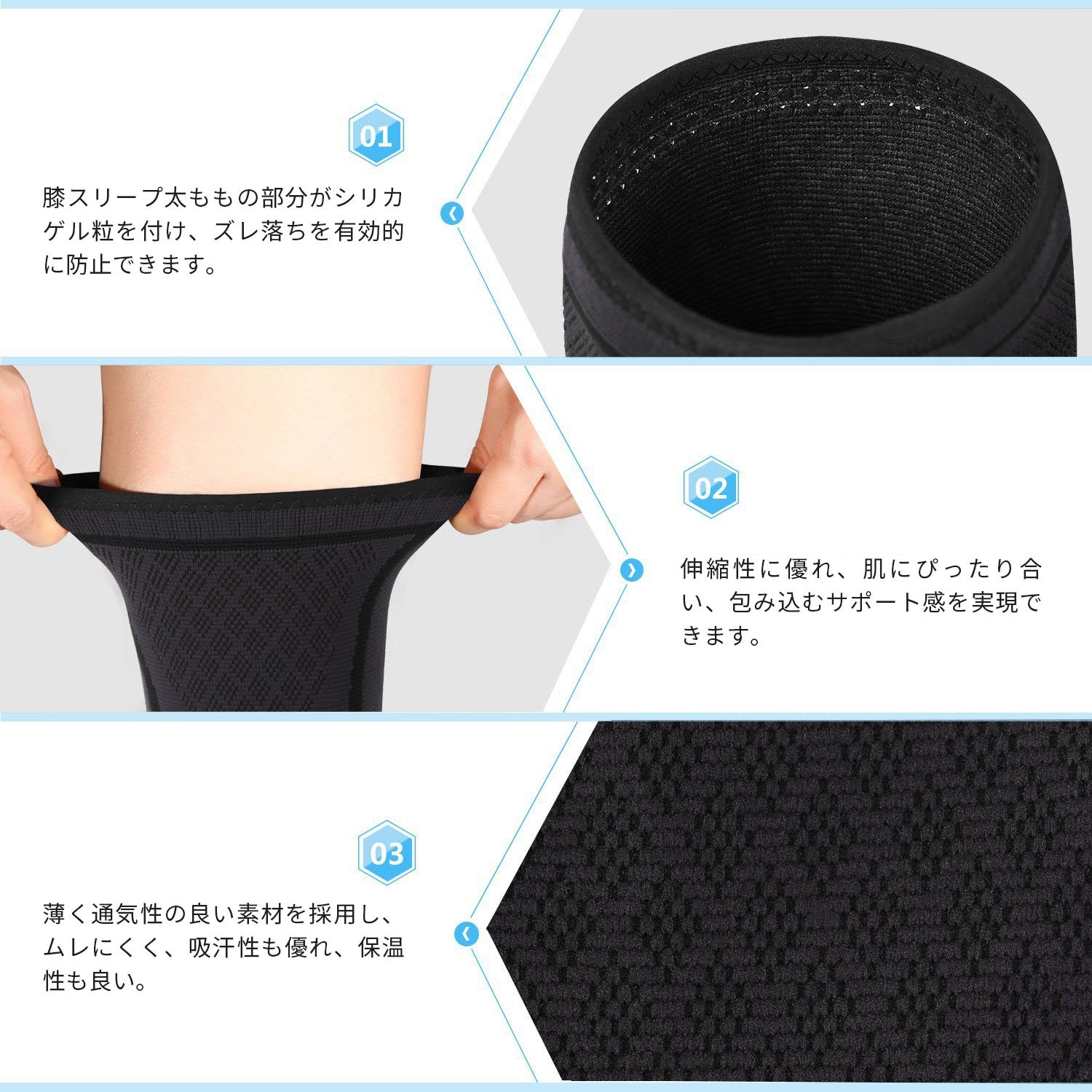 This exercise knee supporter adopts 55% nylon, 35% rubber, 10% polyurethane fabric, it is thin and soft, excellent in breathability and sweat, it is a comfortable and durable product.