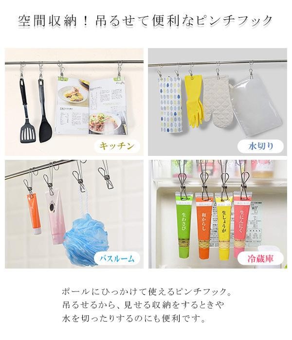 ポールにひっかけて空中収納!ステンレスで錆びにくいからいろんな場所で使用できます。キッチンまわりには、キッチンツールやレシピを吊るしたり、クロスやゴム手袋・ミトンを吊るしたり。バスまわりには、洗顔チューブやタオルを吊るしたり。冷蔵庫でごちゃつきがちなチューブ類の整理にも便利です。 |