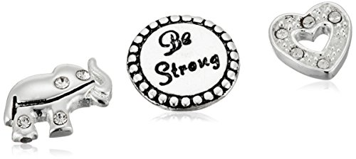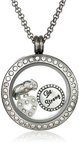 Stainless steel necklace featuring round locket with border of sparkling rounds and trio of floating charms at center