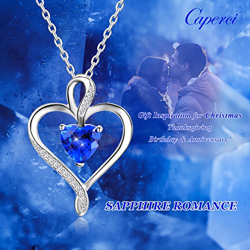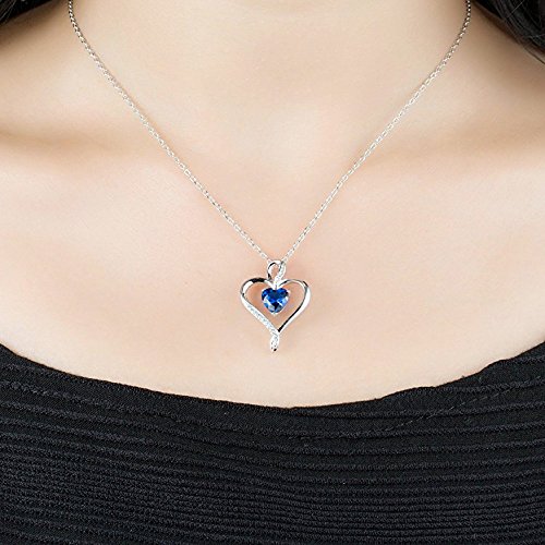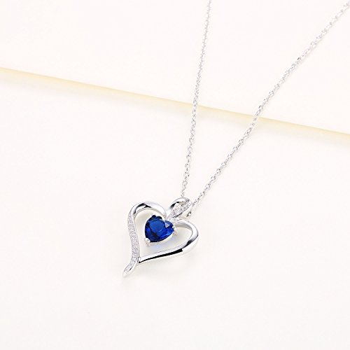 ♣The open heart sterling silver pendant necklace is twisted at the bottom, set with a 3-prong heart cut created blue sapphire and with sparkling small cubic zirconia accents