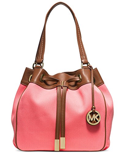 -. Brand : MICHAEL Michael Kors -. EAN : 0889154863460 -. Feature : Coral canvas with luggage leather trim / Magnetic snap closure / Exterior features gold-tone hardware / Interior features 1 zip pocket, 3 open pockets, 1 cell phone pocket, 1 key fob / 14" W x 11-1/2" H x 6-1/2" D; Double handles with 11" drop -. ProductGroup : Shoes -. ProductTypeName : HANDBAG -. Title : MICHAEL Michael Kors Marina Large Drawstring Tote (Coral) -. UPC : 889154863460