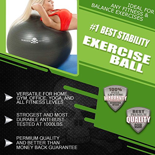 Have you ever imagined purchasing the perfect stability exercise ball? That ideal exercise ball would never lose air, would be easy to inflate, and would serve as your best workout partner in all your balance exercising routines and workouts. Now imagine you only had to ever purchase that inflatable workout ball one time. With the Survival and Cross exercise stability ball, you are well on your way to the perfect fitness routine you have been dreaming of. Best Quality Exercising Ball: - From pilates, yoga, crossfit, abs, back, planks, dips, and back exercises, this inflatable hand pumped ball will see you through until the end