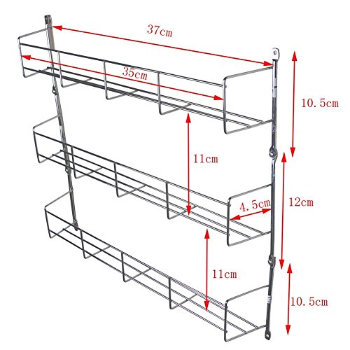 Description Dimensions: 13.8 Inches High x 16 Inches Wide Each Tier. Package size:16.14x6.69x4.33 In. Weight:1.43 lb. Features: The rack comes complete with two sets of screws - One set for fixing to walls and one set for fixing to the inside of cupboards making it easy to assemble in just a few steps. Use the Cabinet Door space efficiently ,No more Haste when cooking Can store 40 jars in total If you Buy the 5 Tiers .Each Tier can hold 8 jars. Easy to Installation.Make your kitchen more clean and tidy, no clutter,Spice bottle can be get conveniently. If you have any questions,please contact with us by email.Best wishes for you and have a happiness life. 0