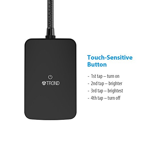 -. Feature : Eye Protection Desk Lamp. Latest surface lighting source and innovative light guide panel help to create a flicker-free, anti-glare daylight light without ghosting with the color temperature of 5800K ~ 6000K. Unlike incandescent or florescent lights, it doesn't contain mercury or other environmentally harmful substances. / Clamp Light with Extra-Long Gooseneck. Strong Aluminum clamp opens up to 1.65" width (optimal 0.6"-1.38" width) and can be used perfectly with music stands, pianos, office tables, computer desks and headboards. Durable gooseneck design with the length of 50cm/19.7", allows you to adjust your lamp with ease and to direct the light wherever you want. / 3-Level Touchable Dimmer. By touching the power icon on top of the lamp head, you can turn on/off the lamp and adjust three different levels of brightness to cater to your various lighting needs. There's not physical power button; everything you need to do with this lamp is to touch the power icon. / Enhanced Brightness. With premium diffusion film invented by SKC Haas from South Korea, we've increased the lamp brightness by 50%. Meanwhile, diffusion films will also increase the angle of visibility by efficiently channeling the light, which leads to a larger lighting area. / What You Get: TROND Halo 9W-C LED Clamp Lamp, 6ft UL-certified detachable power Adapter, Welcome Guide, 18-MONTH TROND warranty & 30-DAY money back guarantee.
