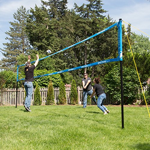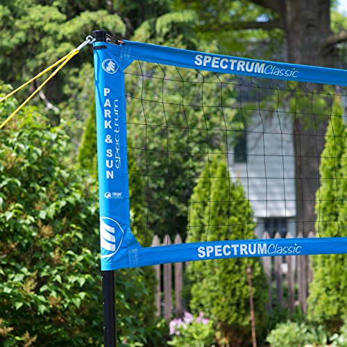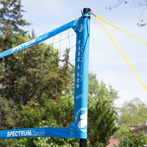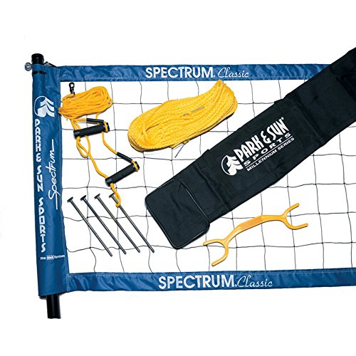 Amazon.com Product Description The Park and Sun Sports TS-CL Spectrum Classic Volleyball Net offers great performance and is a snap for quick setup and portability. This professional-level volleyball net system features two-inch, two-piece telescopic aircraft aluminum poles with push-button locking systems for three easy height adjustments (for men's, women's, and coed play). This system also features a three-foot by 32-foot slip-on net designed for maximum "ball-out-of-net-play". It also feature a 0.3125-inch guy line system with handles and 12-inch steel ground stakes. This system also includes a pre-measured boundary with corner anchors, a boundary cord winder, and an equipment bag for easy storage and transport.