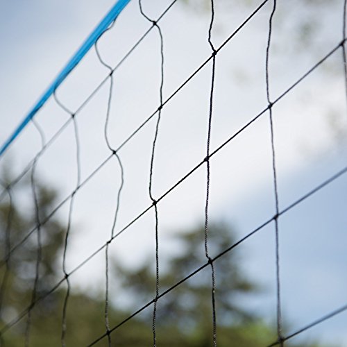 Outdoor volleyball net system with pre-measured boundary lines and varying adjustable heights. Easy to set up on the beach or on grass.