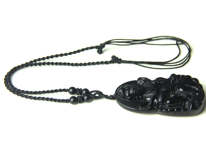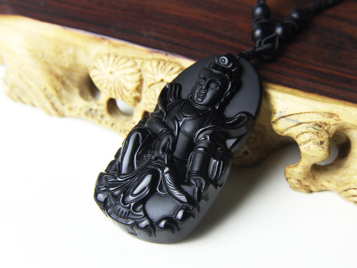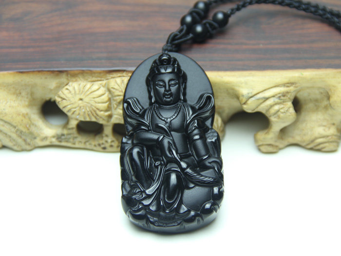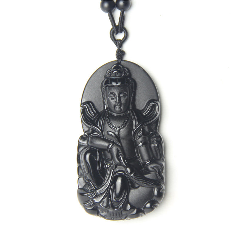 开光磨砂天然黑曜石观音菩萨吊坠 观世音 大气男款