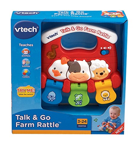 There's fun and discovery at the farm with the VTech Talk and Go Farm Rattle! With this interactive toy, baby learns about animals and colors through a playful game of peek-a-boo. The Talk and Go Farm Rattle is fun at home or on the go with its easy-grab handle. Develop motor skills by flipping the three dangling animal pieces and be introduced to colors and animal names. Push the farm animal buttons to hear short tunes, melodies and animal sounds. Flashing lights attract your baby's attention and encourages interaction and the motion sensor activates a variety of sound effects and melodies. Plays 40+ sing-along songs, melodies, sound effects and fun phrases. The VTech Talk and Go Farm Rattle provides auditory stimulation. Fun and interesting sound effects draw baby's attention to play. Particularly strong within VTech products auditory stimulation helps stimulate and develop a child's senses and in turn helps them learn. From early on children can recognize and discriminate sounds thus, sing-along songs, fun sound effects, and exciting or relaxing voices help improve curiosity and discovery. Infant toy is intended for babies 3 months to 2 years of age. Requires 2 AAA batteries (batteries included for demo purposes only; new batteries recommended for regular use).Feature