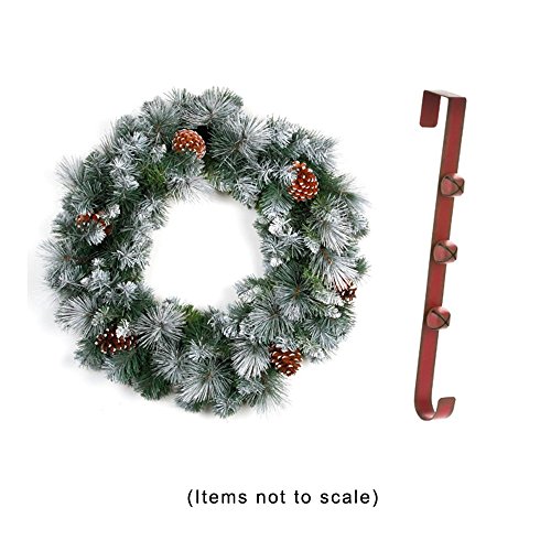 Bundle - Glacier Christmas Wreath with pine cones: 24in - 140 tips with Christmas Wreath Iron Door Hanger with Bells - 3.75 x 15 x 1in (Red)