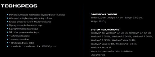 The Ryos MK Pro offers totally customizable, ROCCAT-engineered Per Key Illumination in two convenient modes: smart and manual. This means you can add awesome special effects to your keystrokes, configure your keyboard to highlight your in-game and application key bindings, your modifier keys, your macro sequences and cool downs, your system controls, and much, much more. The included software development kit ensures that only your imagination is the limit. With the Ryos MK Pro, Easy-Shift[+] becomes the completely remappable easy keyboard. Together with the Easy-Shift[+] and FN keys, you can assign a secondary key function to virtually every key on the keyboard, to suit every game and key configuration. Add to this the fact that you can store over 500 macros in the keyboard's flash memory and you've got an insanely customizable, fast-acting piece of gaming hardware on your hands. The Ryos MK Pro features ultra-advanced anti-ghosting with N-Key Rollover. This means that no matter how frenzied your intense gaming sessions get, your keyboard will always register every keystroke - and never let you down. Owing to its whopping 32-bit ARM Cortex processor, the Ryos MK Pro comes out swinging. Since the MCU is so powerful, not one of the keyboard's advanced features sacrifices an ounce of performance. And with 2 MB of flash memory to store your configurations, your keyboard will executive all of your keystrokes and macros in real time, without any delay. With ROCCAT R.A.D. you'll never miss a trick. Monitor your skills with at-a-glance overviews of important statistics, win awards when you hit crucial milestones - and then show friends on Facebook and other social media how excellent you are.Feature