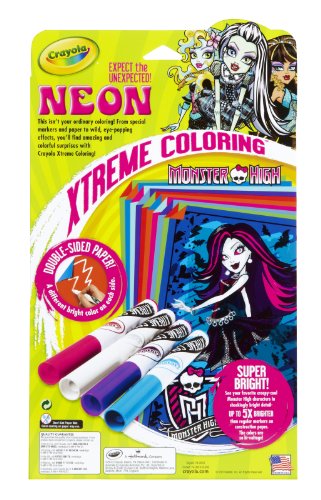 -. Binding : Toy -. Brand : Crayola -. EAN : 0071662139124 -. Feature : New micro format paper and markers magically creates colors that are up to 5 times brighter than regular markers on construction paper / Create eye-popping neon effects / Neon xTreme coloring lets you create shockingly bright colors on colored paper / The Magic of Color without the Mess / Let kids be their own creative magicians -. IsAdultProduct : 0 -. ItemPartNumber : 74-3912 -. Label : Binney & Smith -. Manufacturer : Binney & Smith -. Model : 74-3912 -. MPN : 74-3912 -. PackageQuantity : 1 -. PartNumber : 74-3912 -. ProductGroup : Toy -. ProductTypeName : TOYS_AND_GAMES -. Publisher : Binney & Smith -. Studio : Binney & Smith -. Title : Crayola Neon Extreme Monster High Coloring Kit -. UPC : 783329612320 -. Warranty : No Warranty