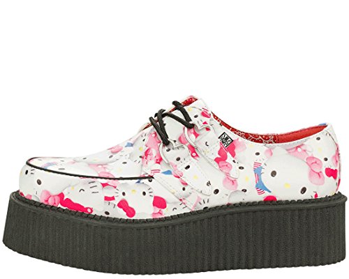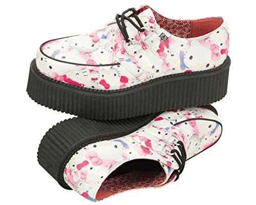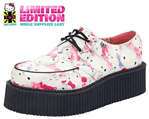 These adorable Hello Kitty® creepers feature the traditional Kitty face in a new pattern on white faux leather with pink, black, blue, and yellow accents. The D-rings are heart shaped for additional detailed cuteness! These shoes have our traditional 1.75" platform soles. Vegan Friendly! T.U.K. Original Footwear has been creating bold, original footwear for men & women since 1991. Footwear inspired by bands, artists, fashionistas and individuals with eclectic tastes, continually providing creative style with an original edge.Feature