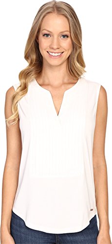 Sleeveless split neck knit top with pleated bib tuxedo panel